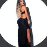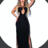 Este deslumbrante vestido está diseñado para quienes quieren hacer una entrada impactante. Con un corte ultra ajustado que abraza cada curva, el vestido presenta un escote profundo y tirantes finos que dejan los hombros al descubierto, aportando un aire provocador y seductor. La abertura alta en la pierna añade un toque atrevido al diseño, mientras que la espalda descubierta lleva el look al siguiente nivel de sensualidad.